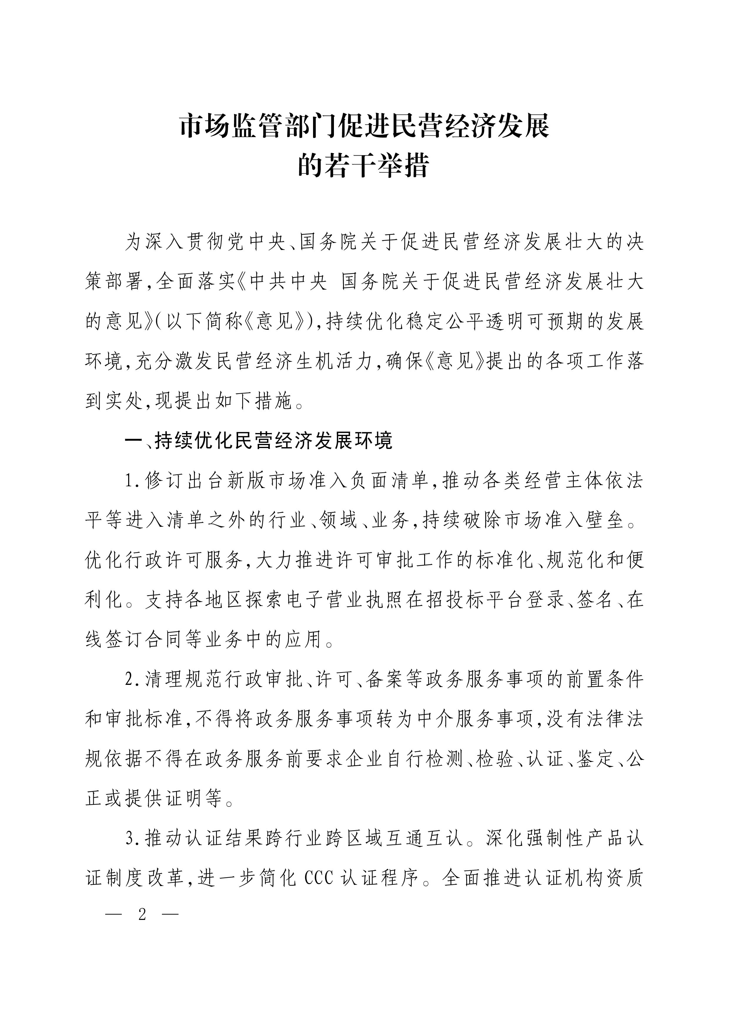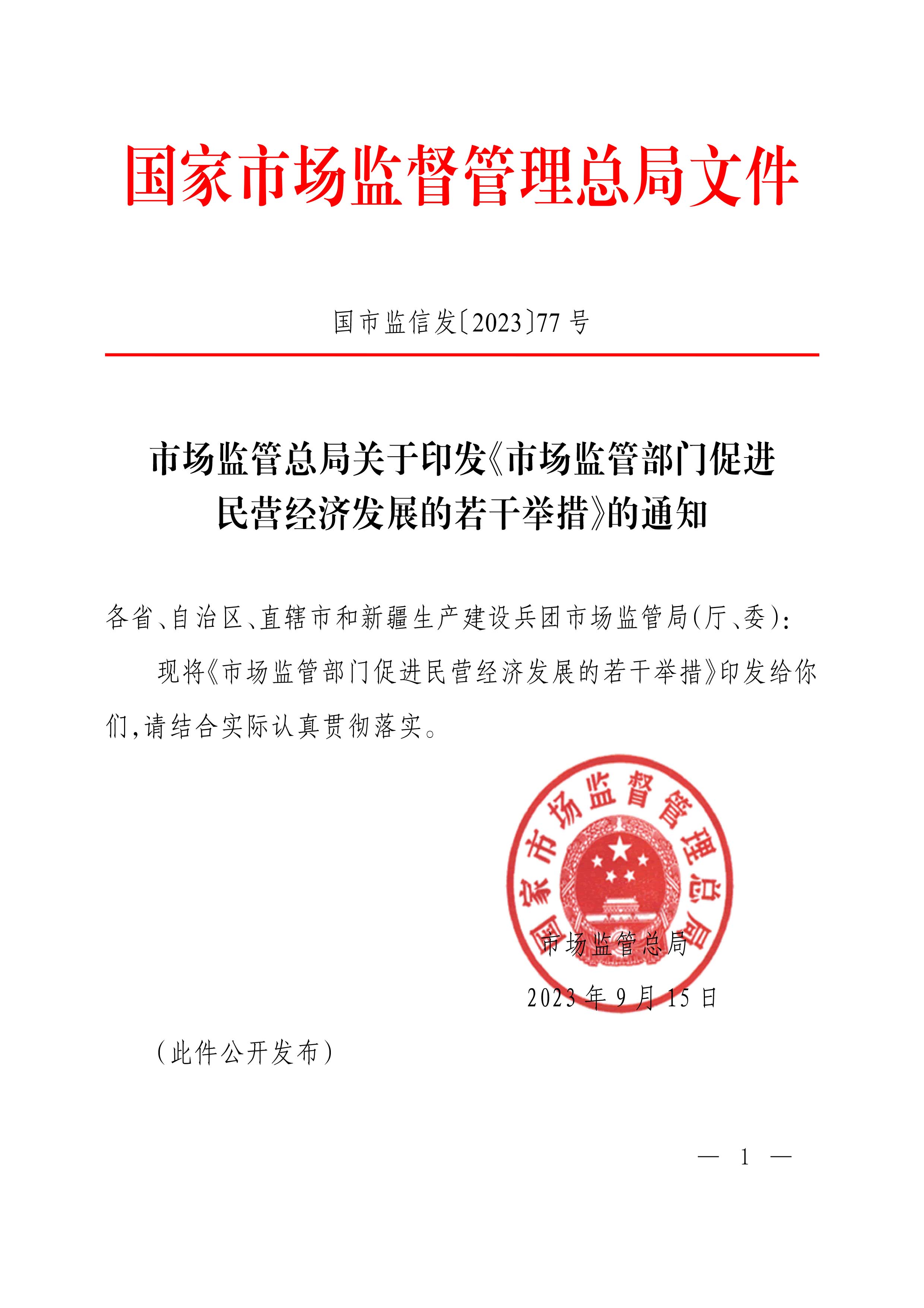 市场监管总局关于印发《市场监管部门促进 民营经济发展的若干举措》的通知