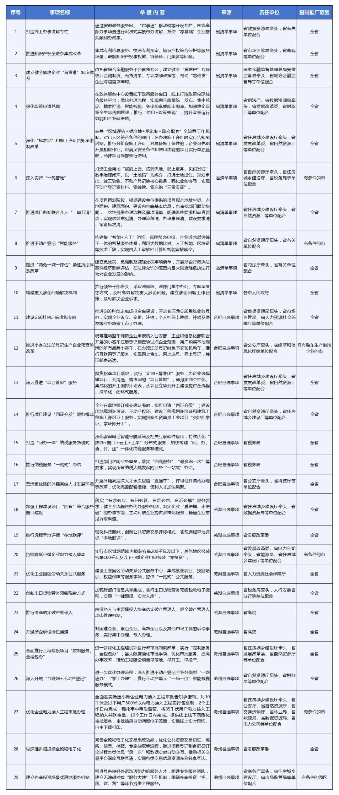 为贯彻党中央、国务院及省委、省政府关于优化营商环境部署要求,推动对照最高标准、最佳实践主动改革创新,今年5月以来,我省启动营商环境改革创新示范区建设,在合肥、芜湖、滁州3个城市开展第一批改革试点,形成了一批可供复制推广的试点经验。为扩大改革效果,加快推进全省营商环境优化提升,现就做好复制推广相关工作通知如下。