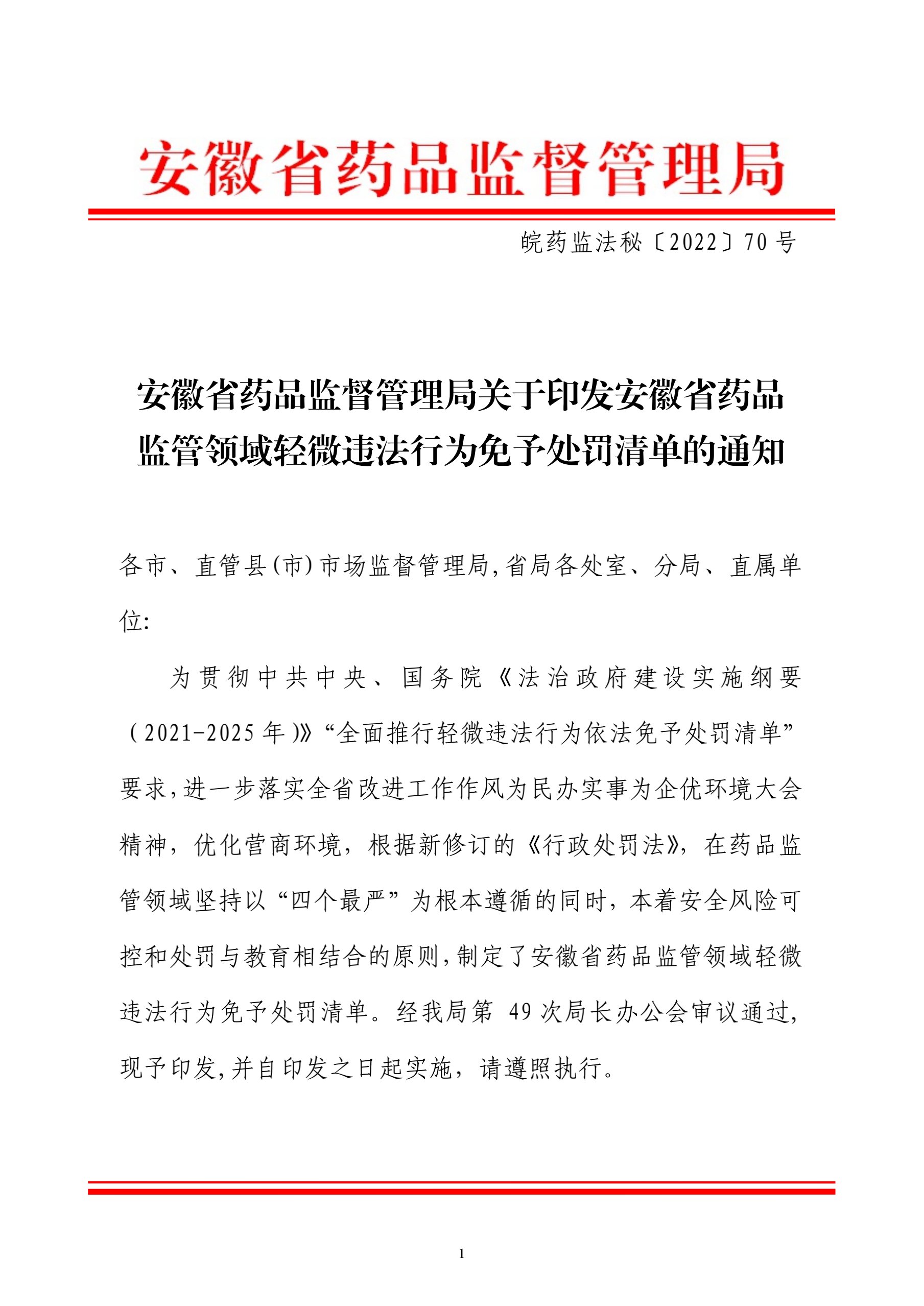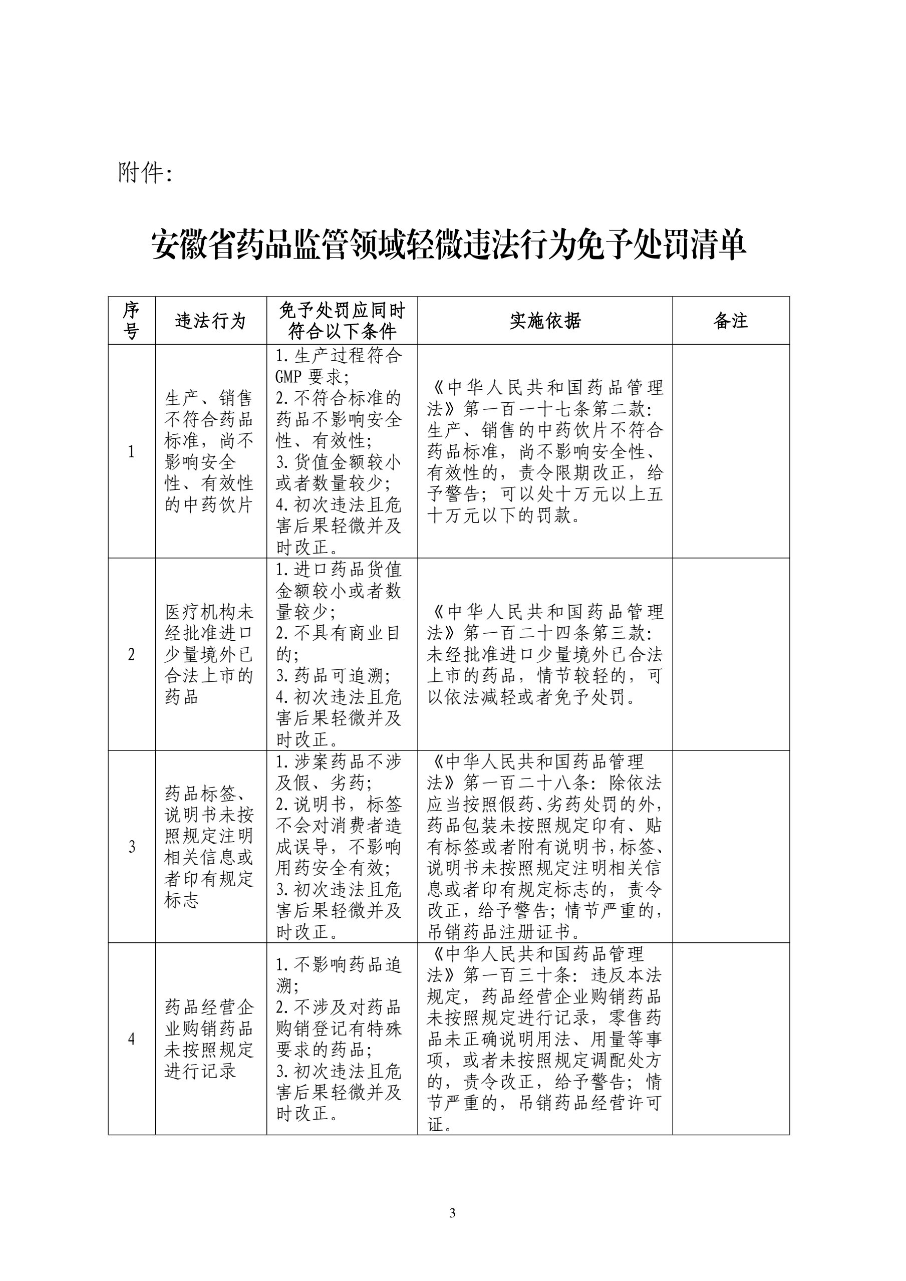 安徽省药品监督管理局关于印发安徽省药品监管领域轻微违法行为免予处罚清单的通知